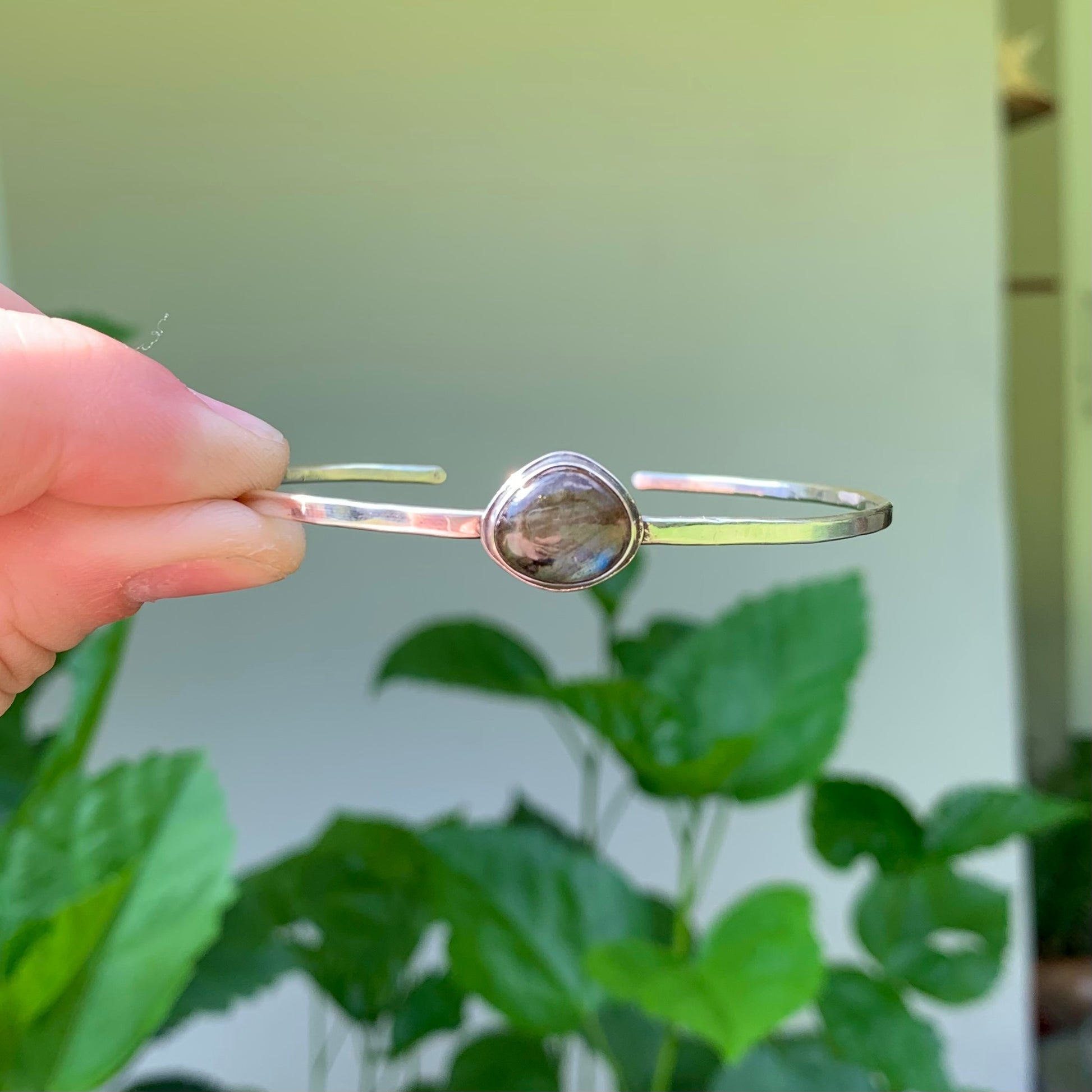 Genuine labradorite stone. Set in sterling silver on a dainty 7” sterling silver cuff.